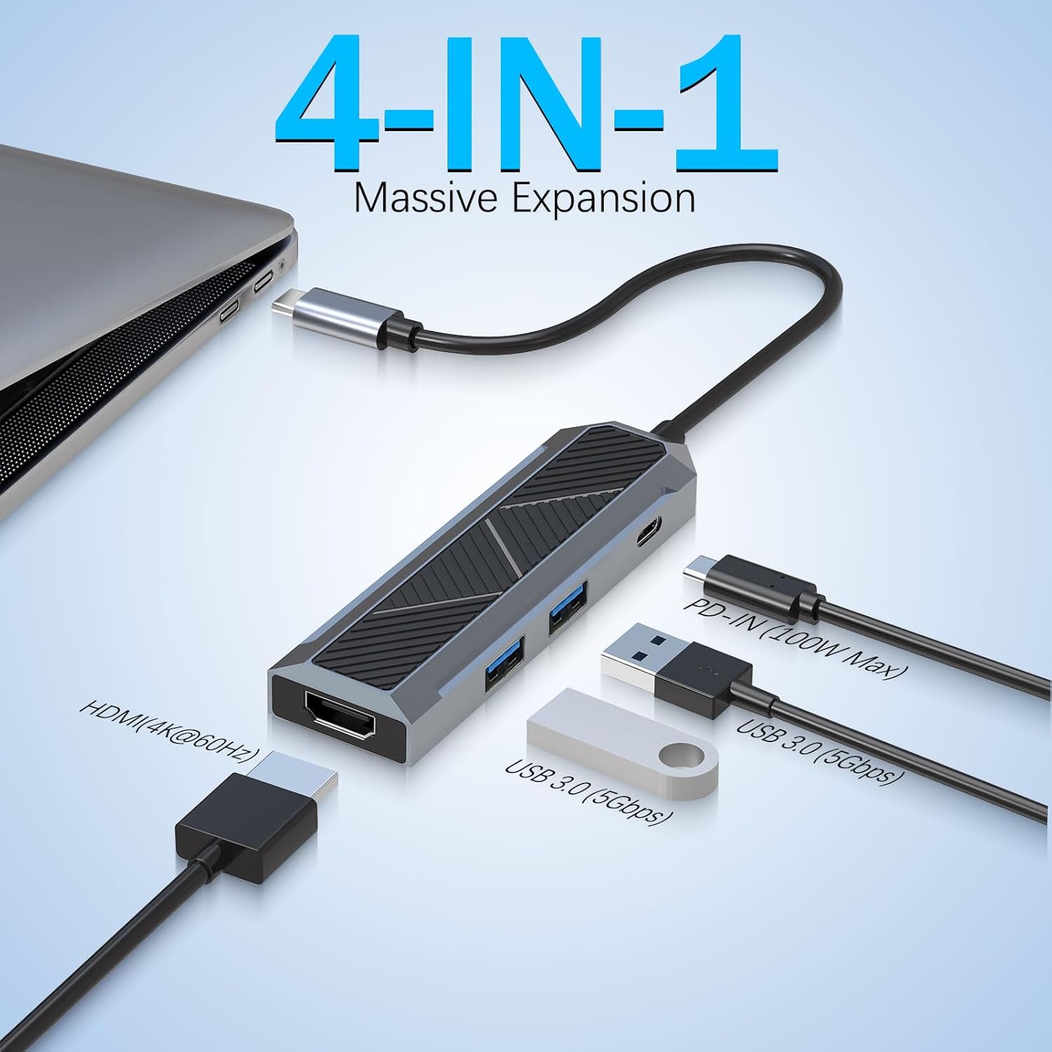 4-i-1 USB-C Hub med 4K 60Hz HDMI Splitter er en praktisk og effektiv løsning til at udvide mulighederne for moderne USB-C enheder. Ved at kombinere højopløsnings HDMI-output med flere USB-dataporte giver hubben brugerne mulighed for at skabe fleksible og produktive arbejdsmiljøer.