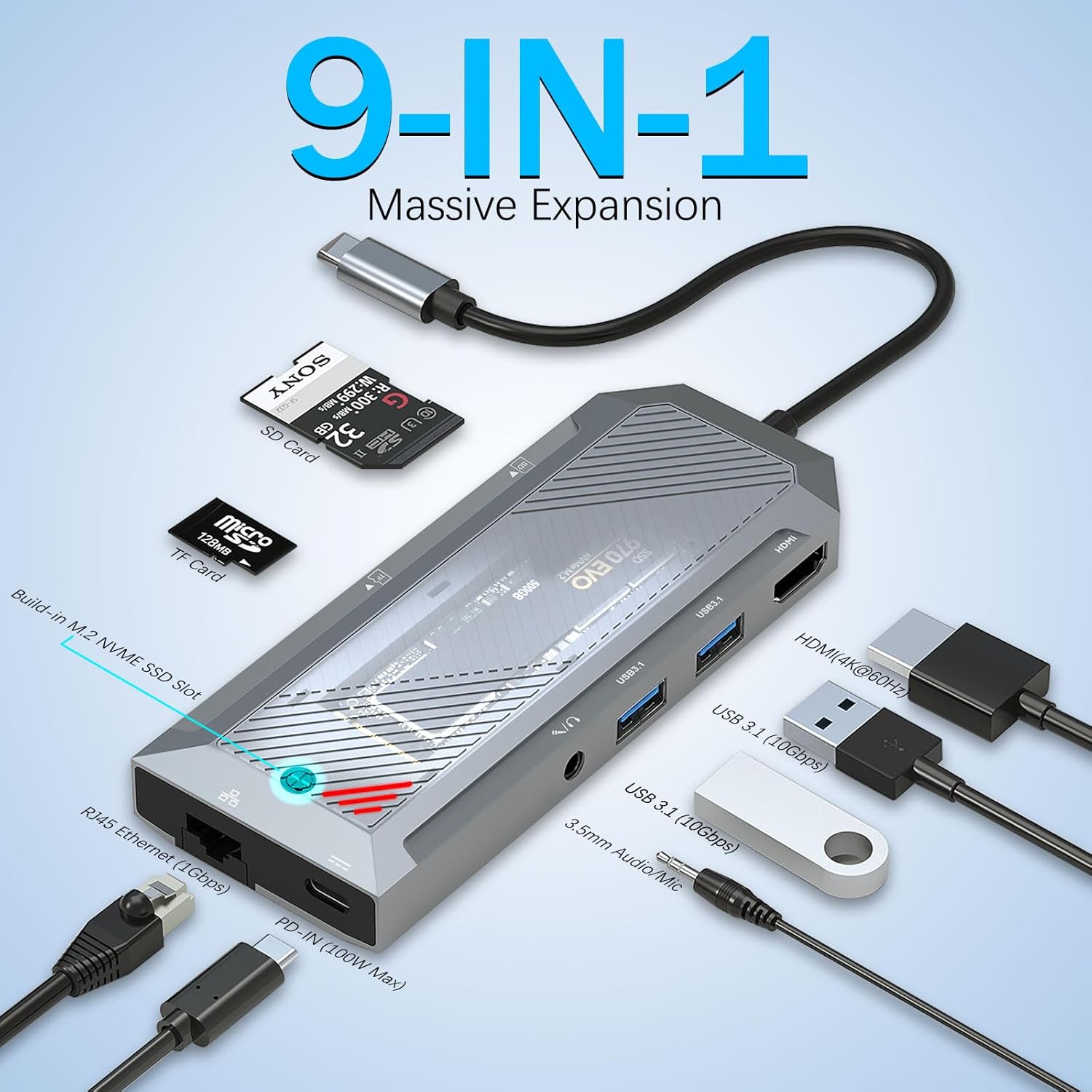 9-i-1 USB-C Hub med SSD-kabinet til M.2 NVMe 4K 60Hz HDMI Splitter – Ultimativ tilslutningsmuligheder og højhastigheds-lagringsudvidelse