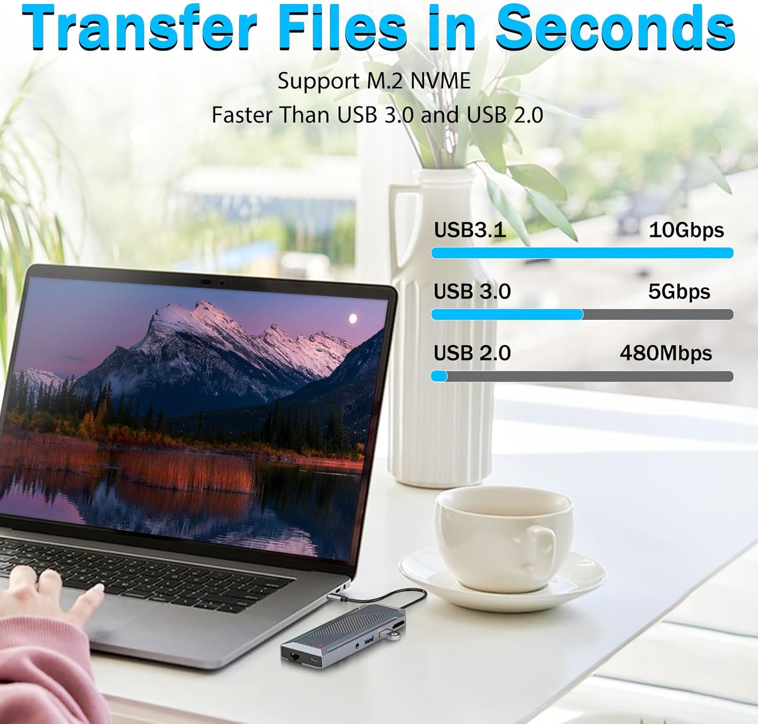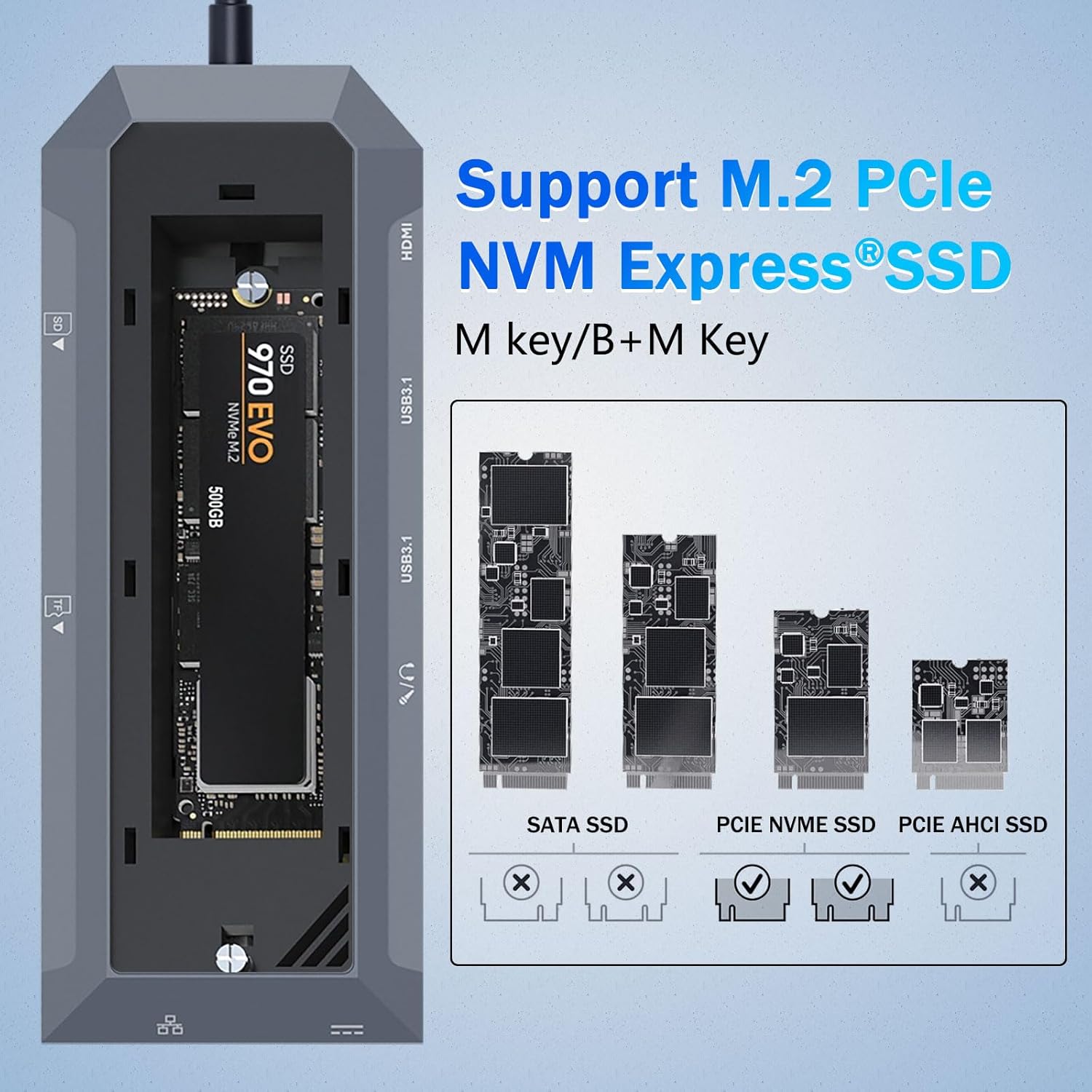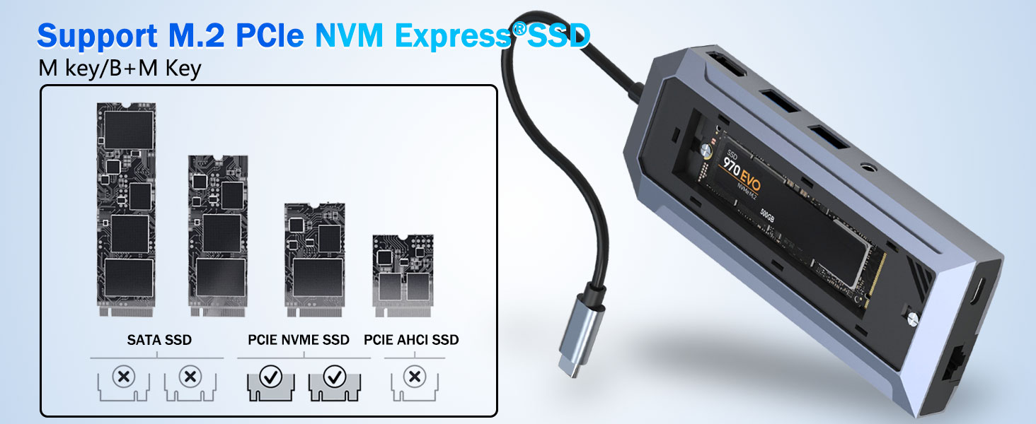 I modsætning til traditionelle USB-hubs inkluderer denne enhed et dedikeret SSD-kabinet, der understøtter M.2 NVMe solid-state-drev. Denne funktion giver brugerne mulighed for at tilføje højhastighedslagring direkte til deres arbejdsområde uden at kræve et separat eksternt drev.