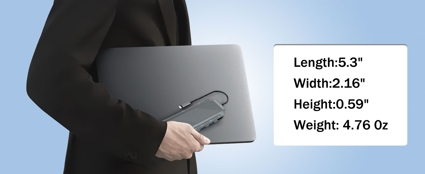 På trods af sin kraftfulde funktionalitet er 9-i-1 USB-C Hub med SSD-kabinet til M.2 NVMe 4K 60Hz HDMI Splitter designet til at forblive kompakt og let. Dette gør det nemt at bære i bærbare tasker, rygsække eller rejsetasker.