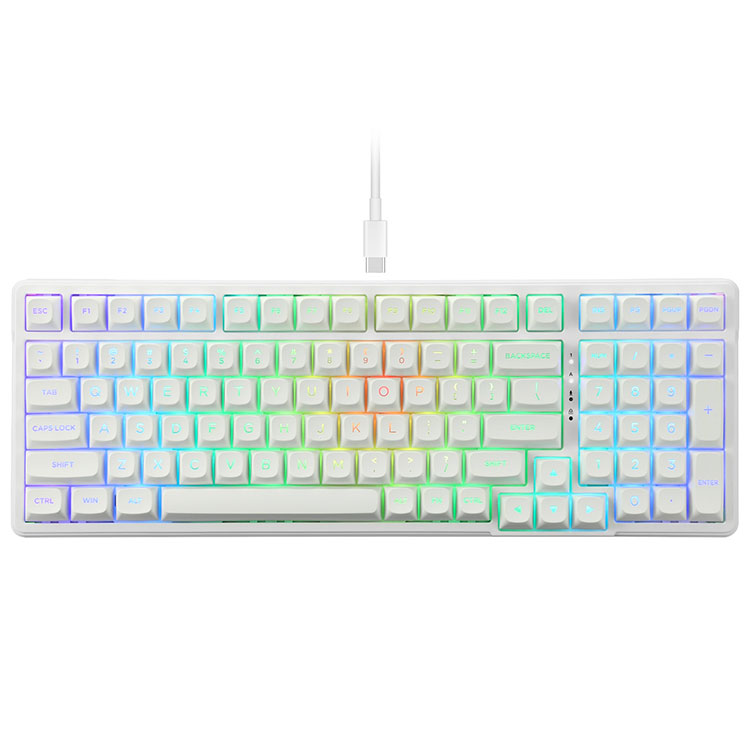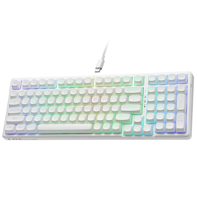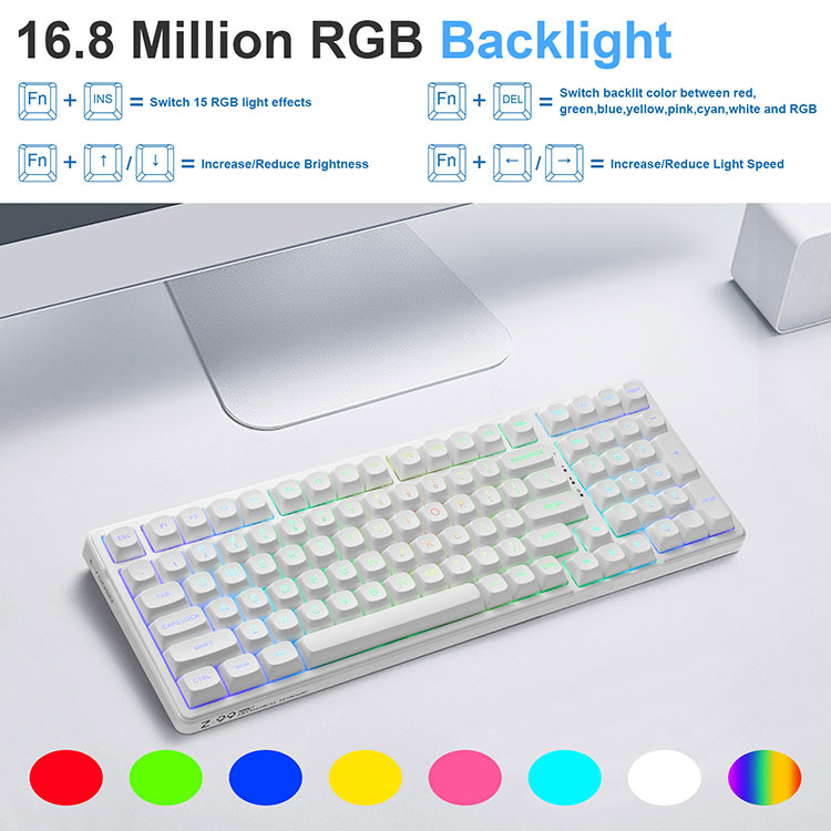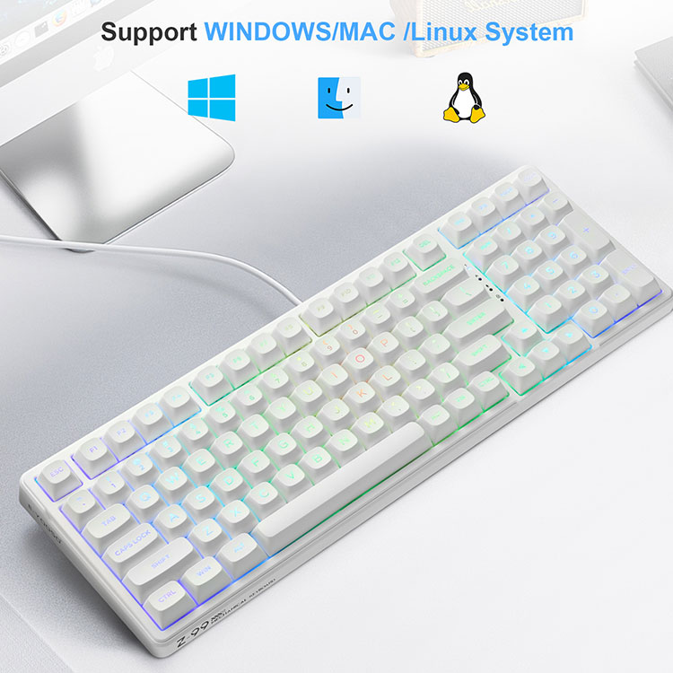 · 【Cool RGB baggrundsbelyst effekt】Z-99 RGB-tastatur inkluderer 15 baggrundslyseffekter og 8 solide baggrundsbelysningsfarveskift. Forskellige RGB-indstillinger beriger din skrivetid. Lyshastighed og -niveau kan også justeres efter dit behov. Dobbeltskud Injection PBT Keycaps, karakter falmer aldrig.