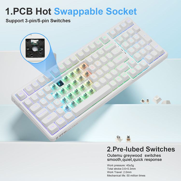 · 【Hot-swappable Custom Keyboard】Kontakterne og tastaturet kan frit udskiftes (nøglehætte/afbryderaftrækker er inkluderet i pakken). Dette brugerdefinerbare tastatur med hot-swap print giver brugerne mulighed for nemt at udskifte 3 ben/5 ben switche uden problemer med lodning. Z-99 mekaniske tastaturer udstyret med forsmurte lineære kontakter, giver jævn skrivefølelse og behagelig skrivelyd, giver hurtig respons til spændende spil.