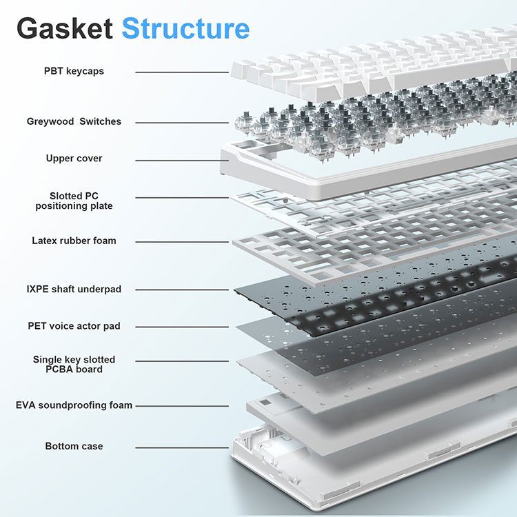 · 【PAKNINGSstruktur med lydabsorberende skum】- GASKET struktur sikrer den højeste kvalitetssikring med stor holdbarhed og stabil ydeevne. Udstyret med 4 lag tykkere lydabsorberende skum, silikonedæmperpude, som reducerer 40 % støj og fjerner 80 % hellig lyd. Giver en cremet lyd, naturlig og klar feedback, ikke mere hulrumsstøj.