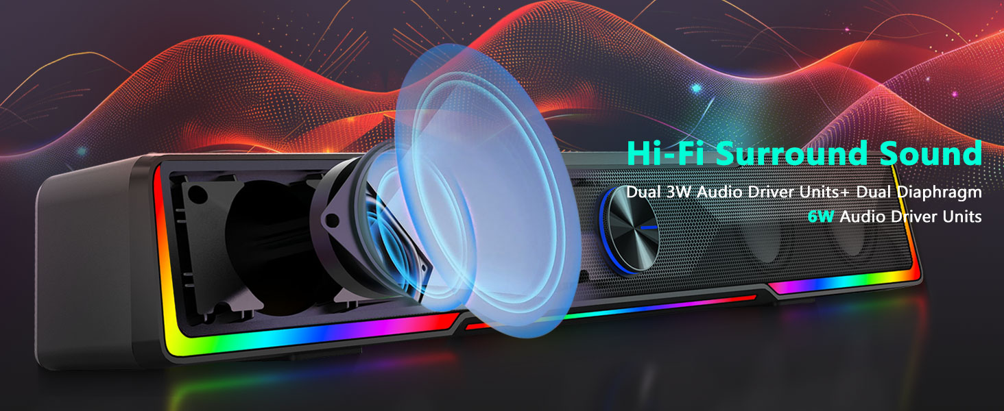 I modsætning til traditionelle højttalere, der optager store områder på begge sider af en skærm, har den sorte GS516 Bluetooth/USB-kablede forbindelse Soundbar Volume Knob Computer Speaker en slank soundbar-struktur, der passer bekvemt under de fleste computerskærme.