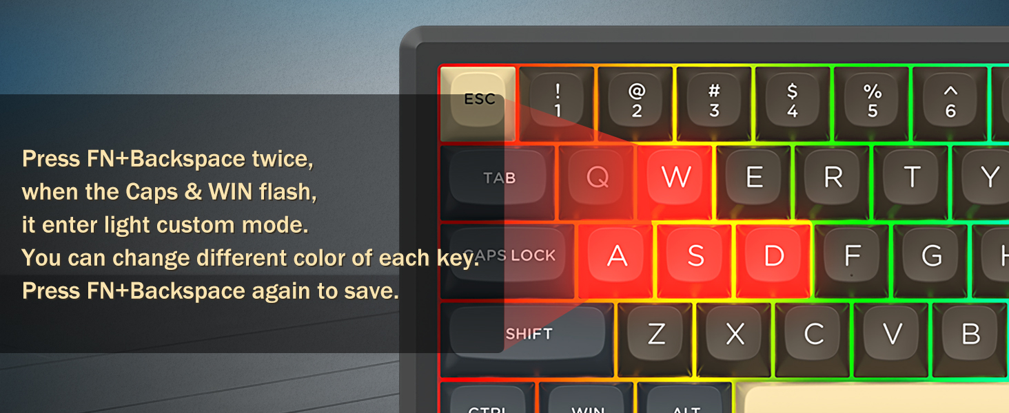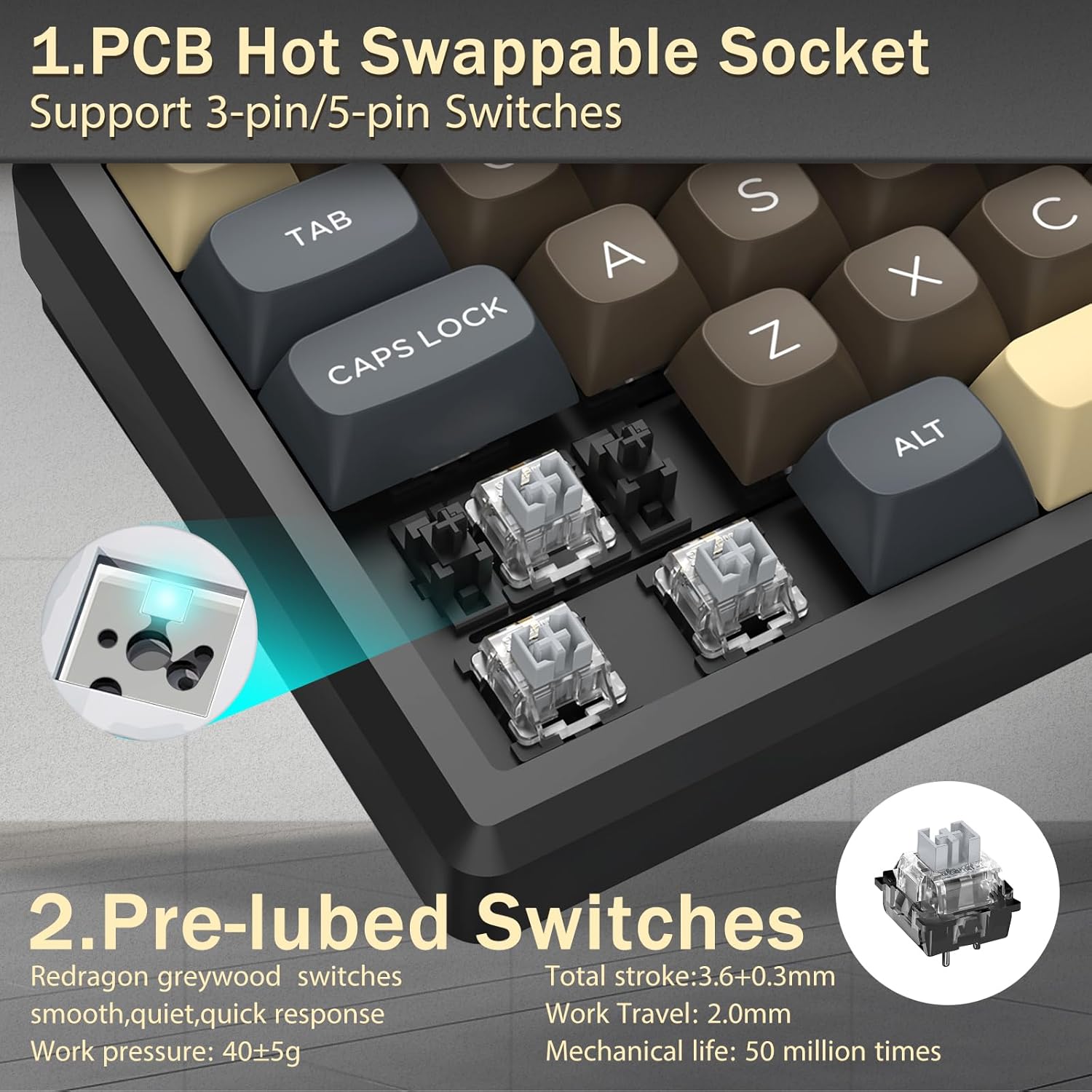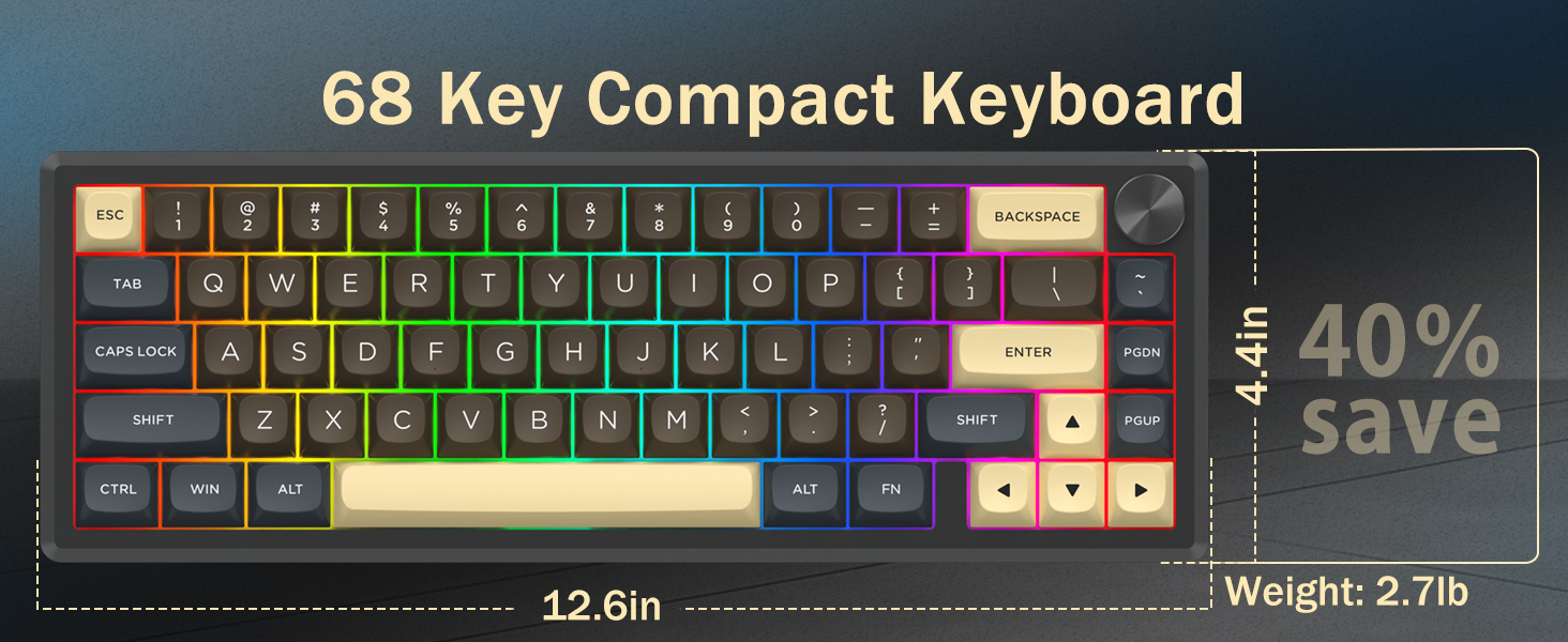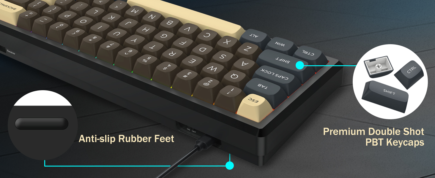 Med dets 60% layout fjerner dette tastatur ikke-essentielle taster, mens det bevarer kernefunktionaliteten gennem tastekombinationer. Dette design hjælper med at reducere rod på skrivebordet og giver mere plads til musebevægelser, hvilket gør det velegnet til både spil- og produktivitetsmiljøer.