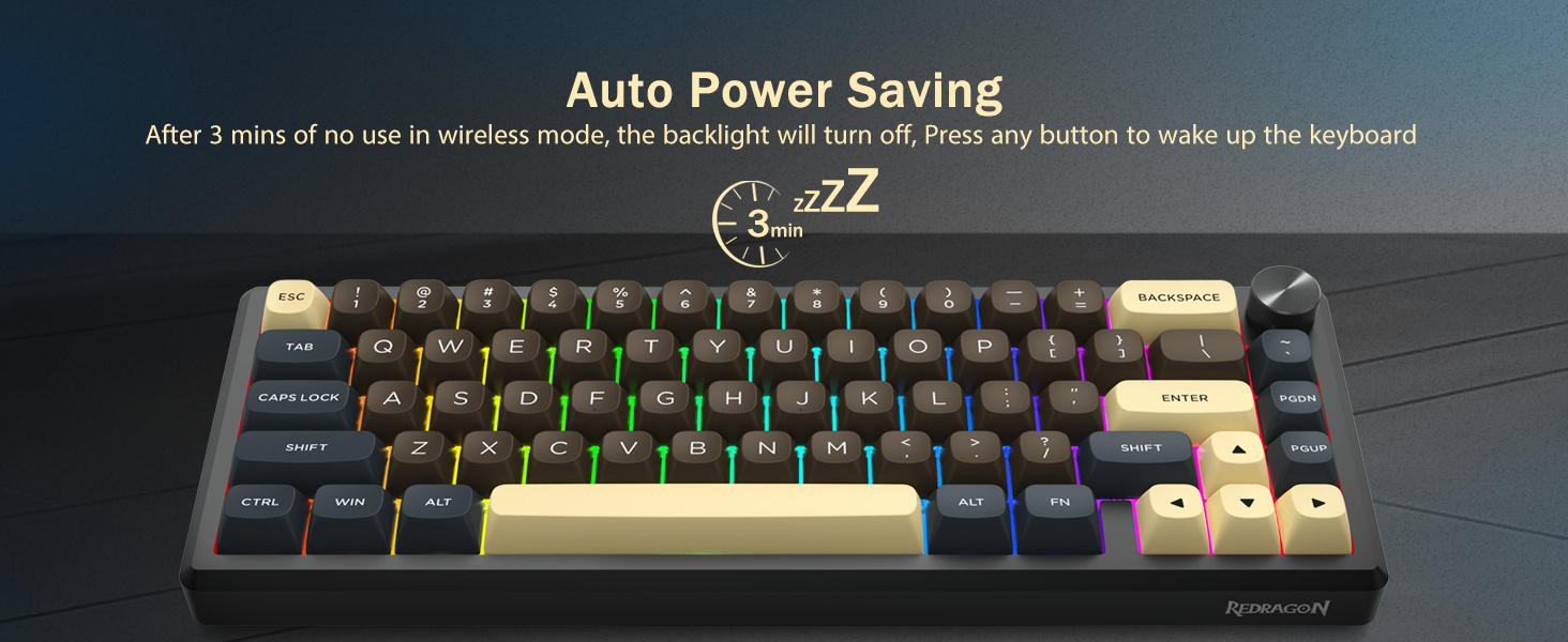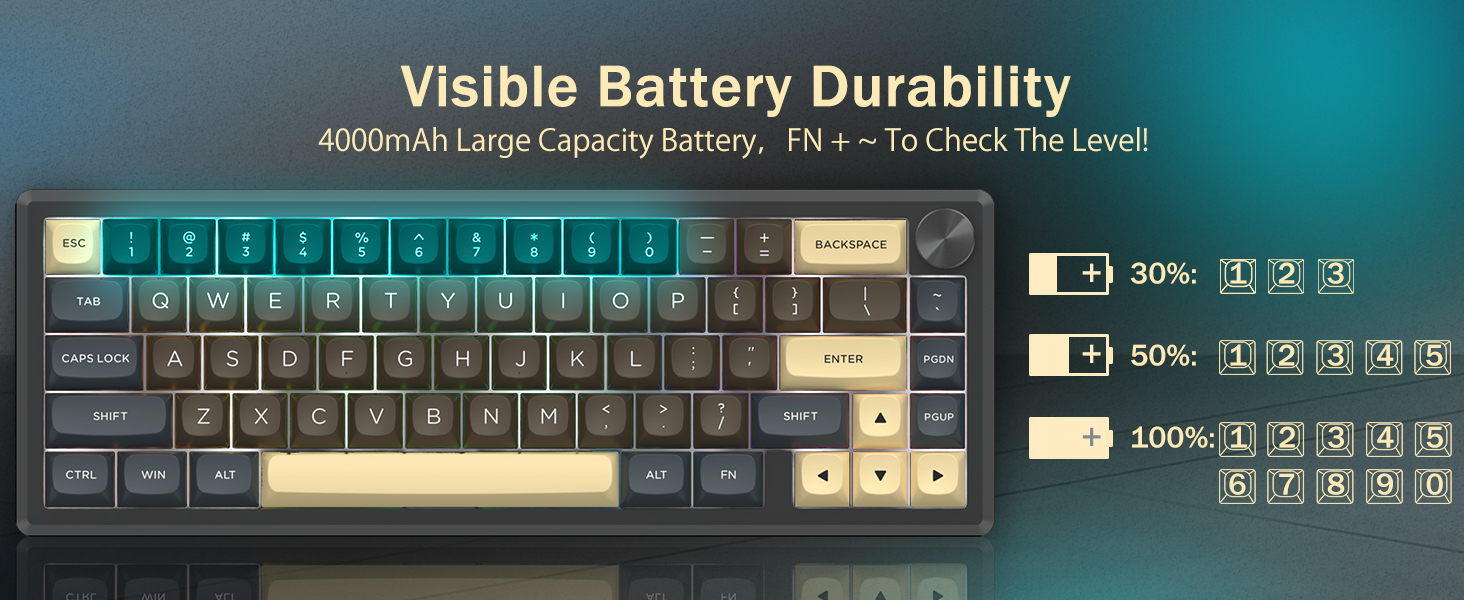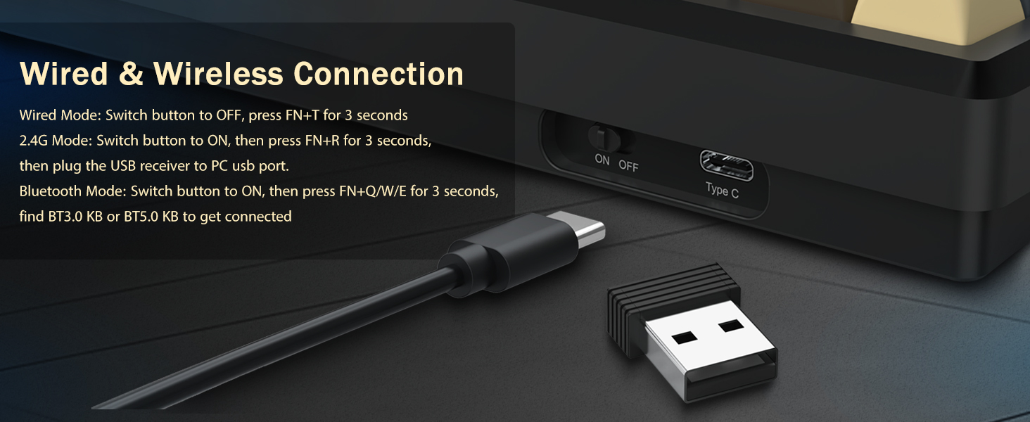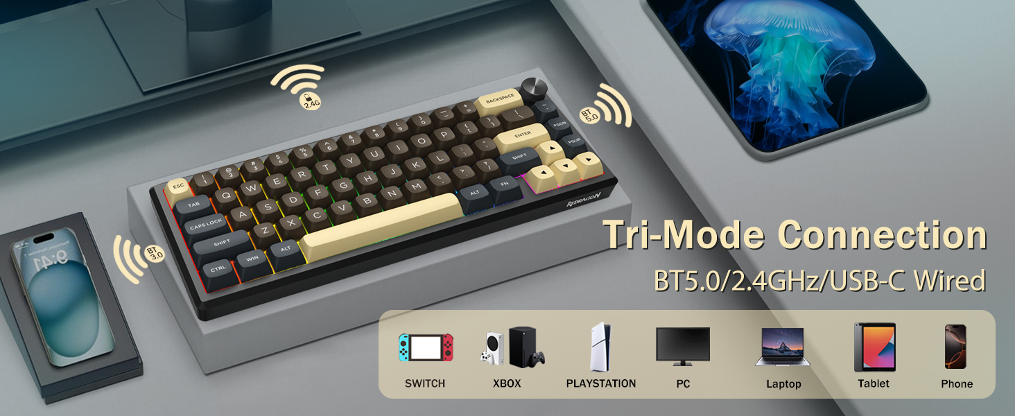 Tastaturet understøtter trådløs tilslutning for bekvemmelighed og en kablet USB-forbindelse for stabil ydeevne. Brugere kan skifte mellem tilstande afhængigt af deres opsætning.