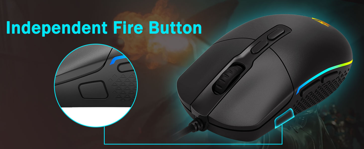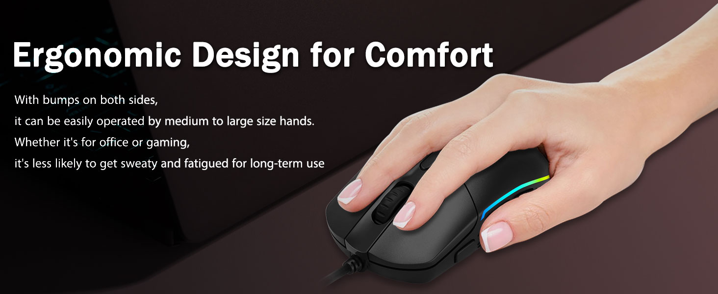 Komfort greb- De ergonomiske buler på begge sider gør, at gaming mus passer i alle hænder. Det giver langvarig komfort for spillere uden træthed, selv under lange timer med intenst gameplay. Den glider ikke, når du løfter gamingmusen eller foretager hurtige og præcise swipes.