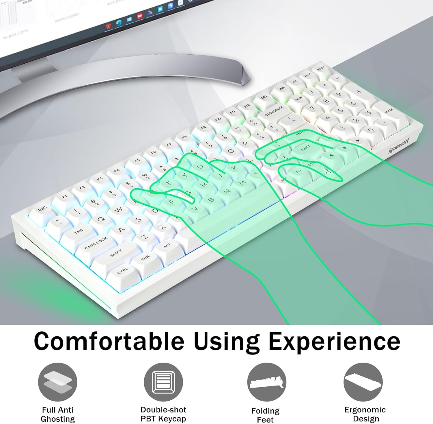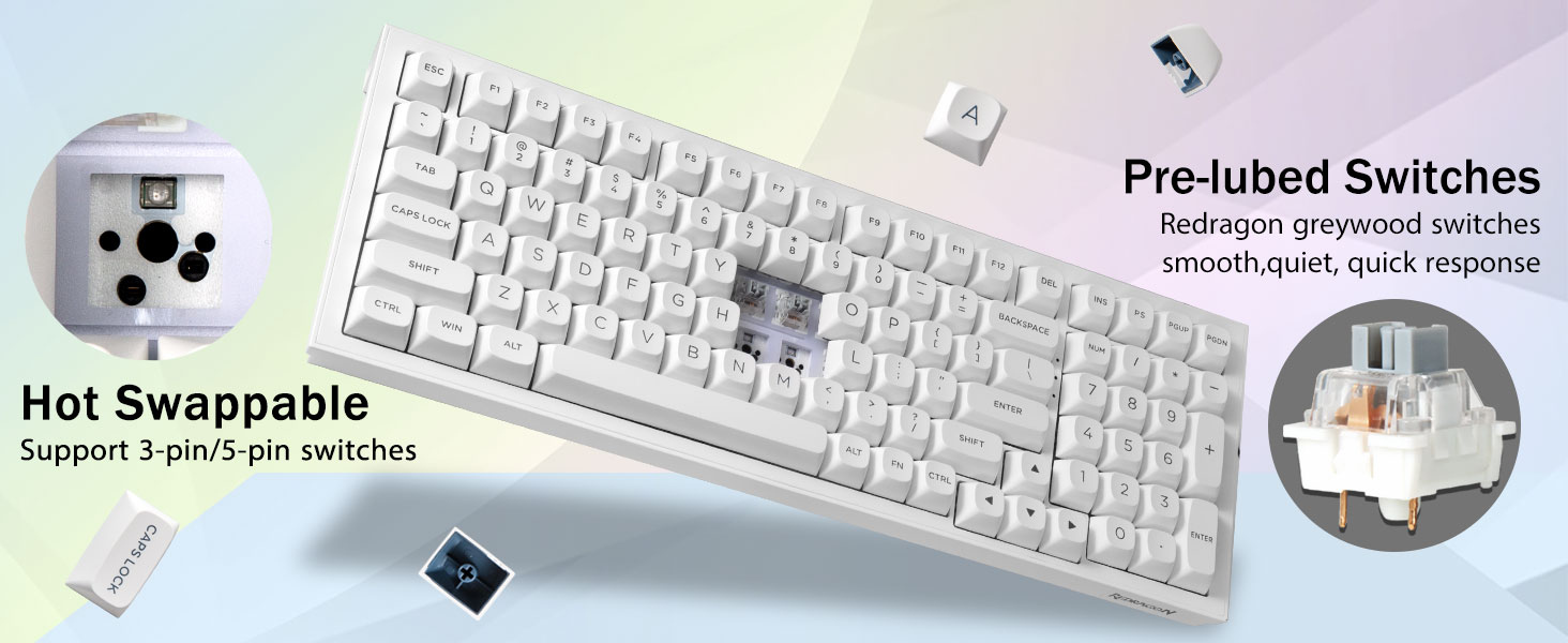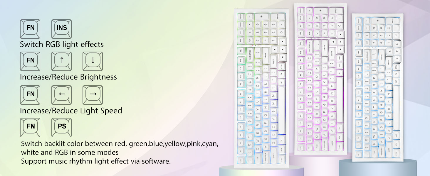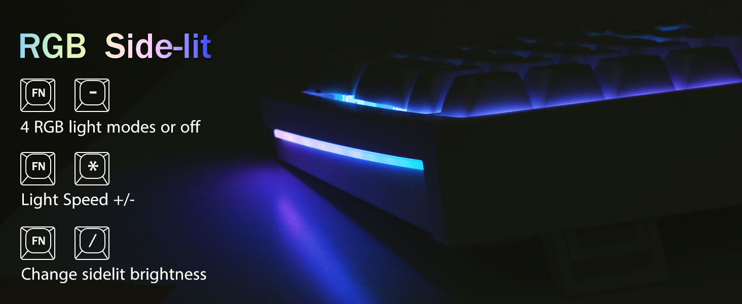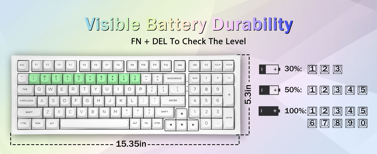 PBT Keycaps og 4000mAh batteri:99 taster 96% layout kompakt tastatur kan spare mere plads på skrivebordet, mens du beholder de nødvendige piletaster og talområde til spil og arbejde. Det genopladelige tastatur indbygget 4000mAh batteri med stor kapacitet for at give mere strøm og længere batterilevetid. Dobbelt skud PBT-tasthætter, lavet af tofarvet materiale støbt ind i hinanden, gør, at tastaturets karakterer bibeholder liv og mætning, klare og ikke falme.