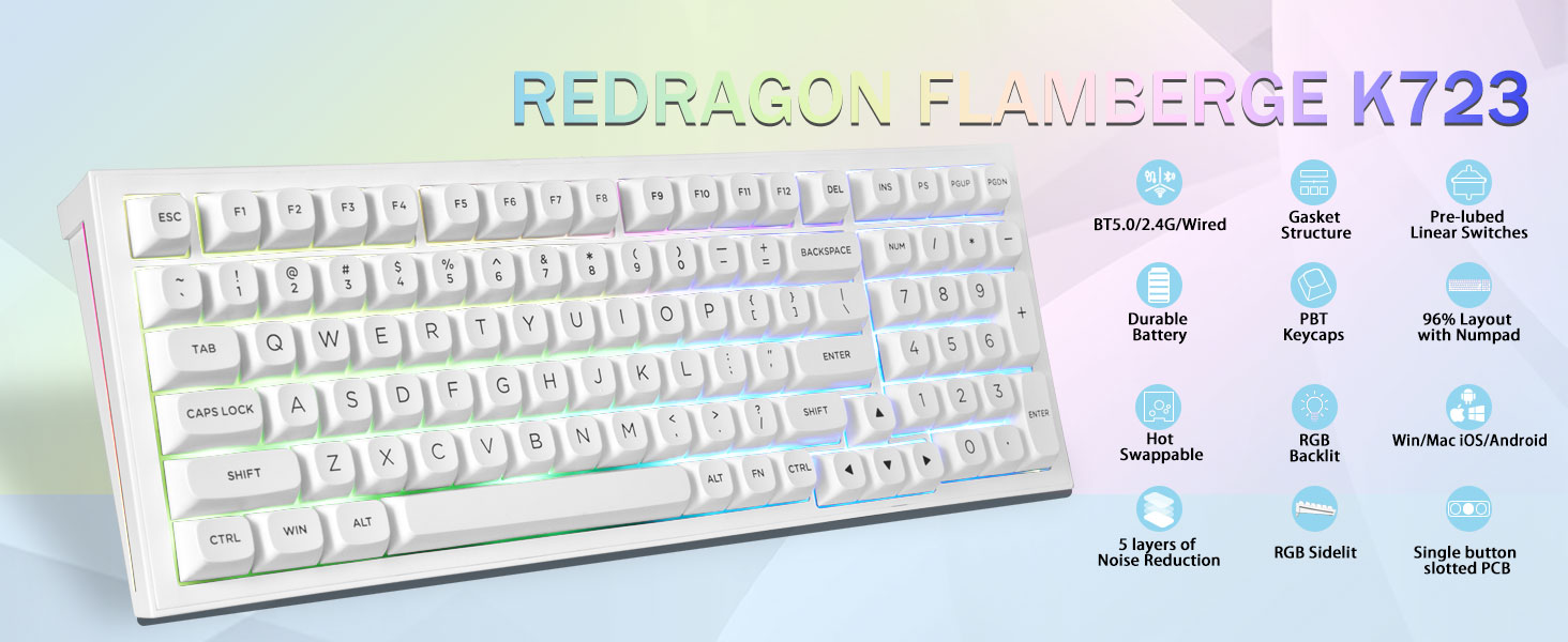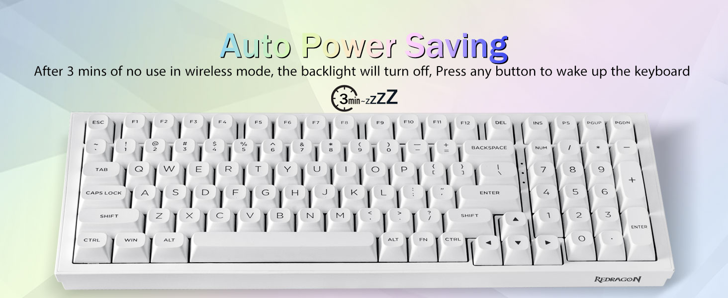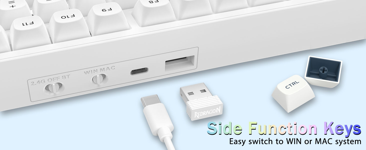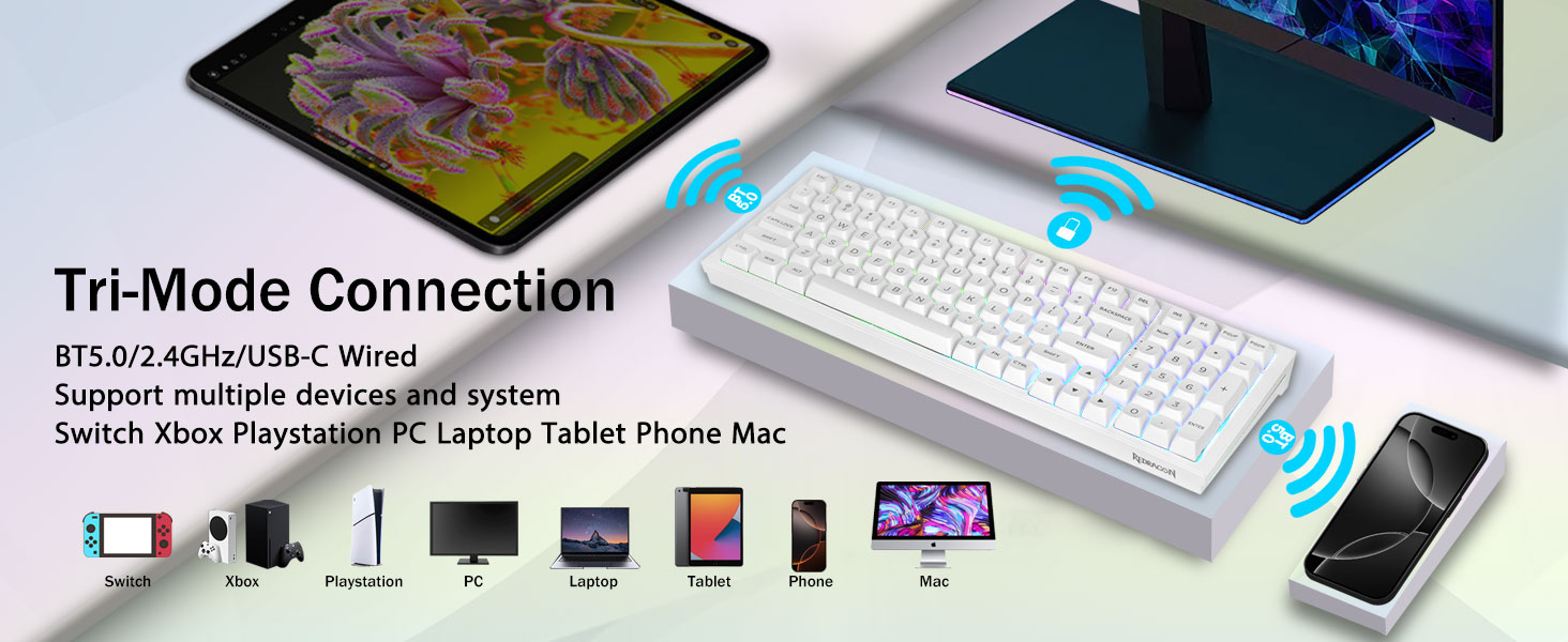 Multi-enhedsforbindelse:Redragon K723 trådløst mekanisk tastatur giver tre tilslutningsmetoder, herunder BT5.0, 2,4 GHz trådløs tilstand og USB-kablet tilstand. Den kan tilsluttes op til fem enheder på samme tid, og skifte mellem dem nemt med FN og tastekombinationstaster. Ingen grænser for din tastaturforbindelse for at imødekomme behovene for arbejde, spil og studier.