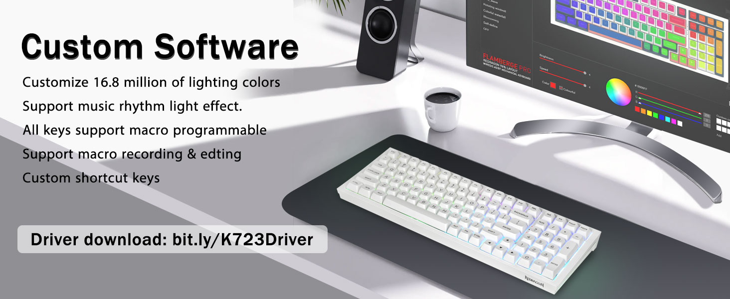 Mekanisk spiltastatur:K723 er et førsteklasses mekanisk tastatur til både arbejde og spil. Med 16 RGB lyseffekt tilføjer en fantastisk atmosfære til spillerummet. Taster understøtter makrotilpasning, som tillader makrooptagelse og redigering, tilpasse tastefunktion og 16,8 millioner lysfarver og understøtter cool musikrytmelyseffekter med driver. N-tast rollover, tastatur kan reagere på flere tastetryk på samme tid, hvilket er nyttigt i meget spændende real-time spil.
