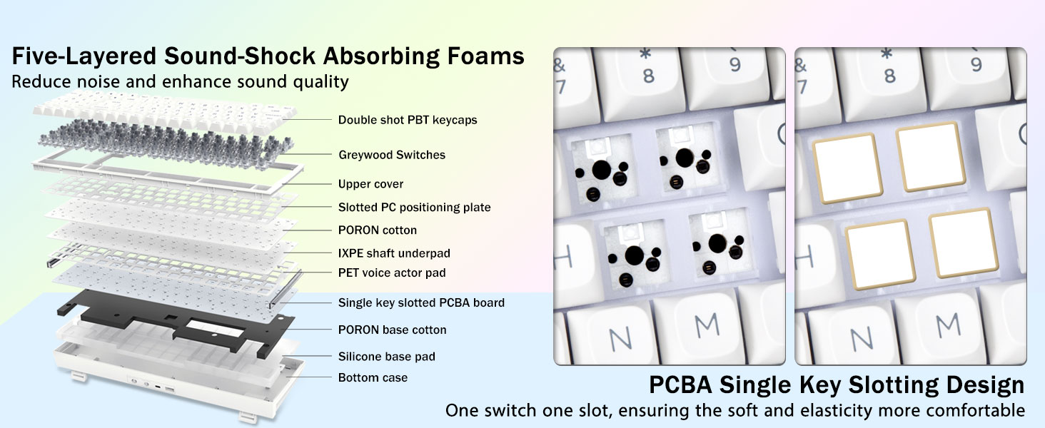 Pakningsstruktur og PCB Single Key Slotting:Dette computertastatur har en pakningsstruktur, udvidet integreret silikonepude og PCB enkelt nøgleslidsning, der optimerer spændstighed og stabilitet bedre, hvilket får hånden til at føles blødere og mere elastisk. Fem lag påfyldningslyddæmper udfylder hullet mellem printpladen, positioneringspladen og skaftet, og modvirker effektivt kavitetsstøjen fra skaftet, der rammer positioneringspladen, og giver en solid fornemmelse.