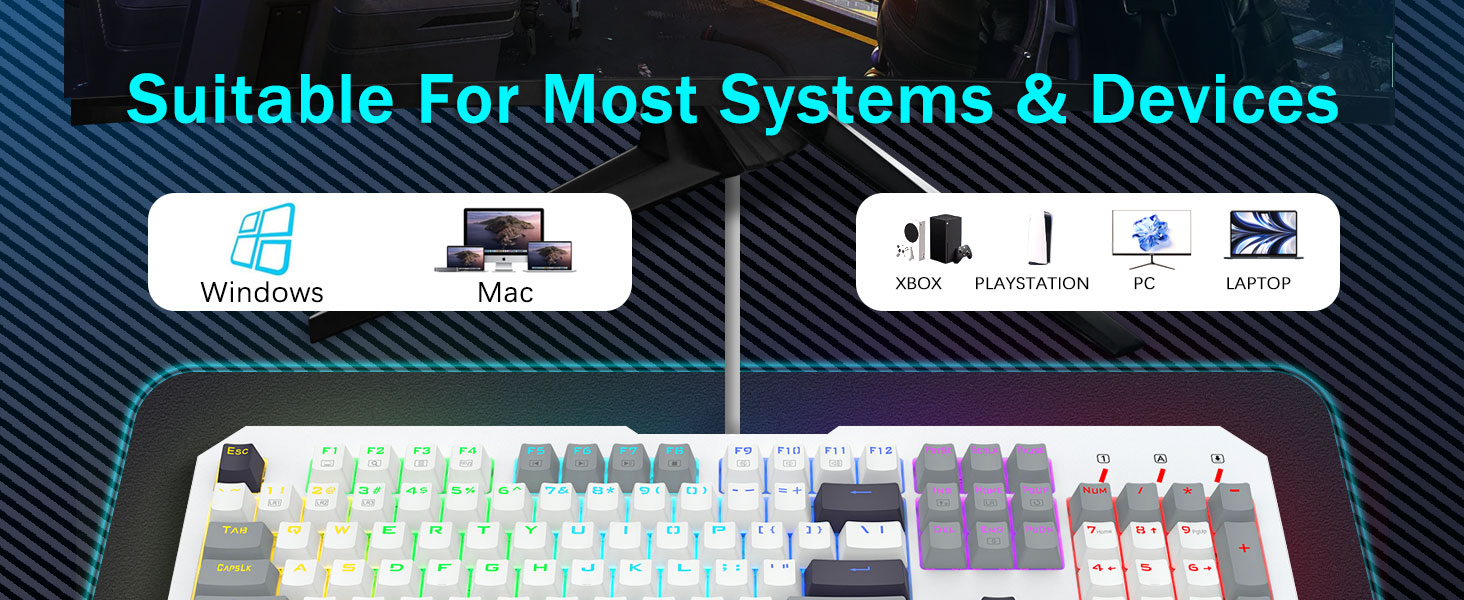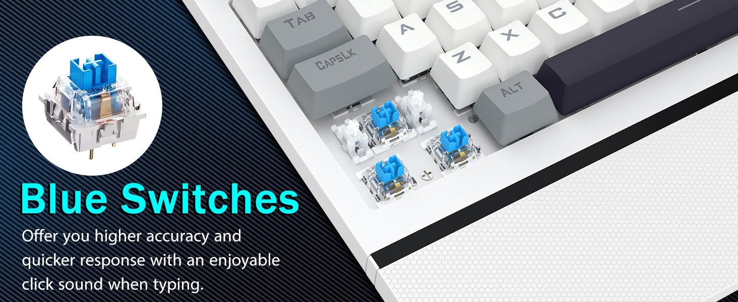 【Responsive blå kontakter til præcisionstastning】Vores pc-tastatur har klikblå kontakter, der giver lynhurtige responstider og bemærkelsesværdig nøjagtighed. Hvert tastetryk producerer en tilfredsstillende kliklyd, der forbedrer din skriveoplevelse. Med dybere tastevandring, stærkere feedback og bredere tasteafstand er skrivning ikke kun mere præcis, men også langt mere behagelig. Hvis du er fan af den taktile, "klikagtige" følelse, er vores tastatur det perfekte valg for dig.
