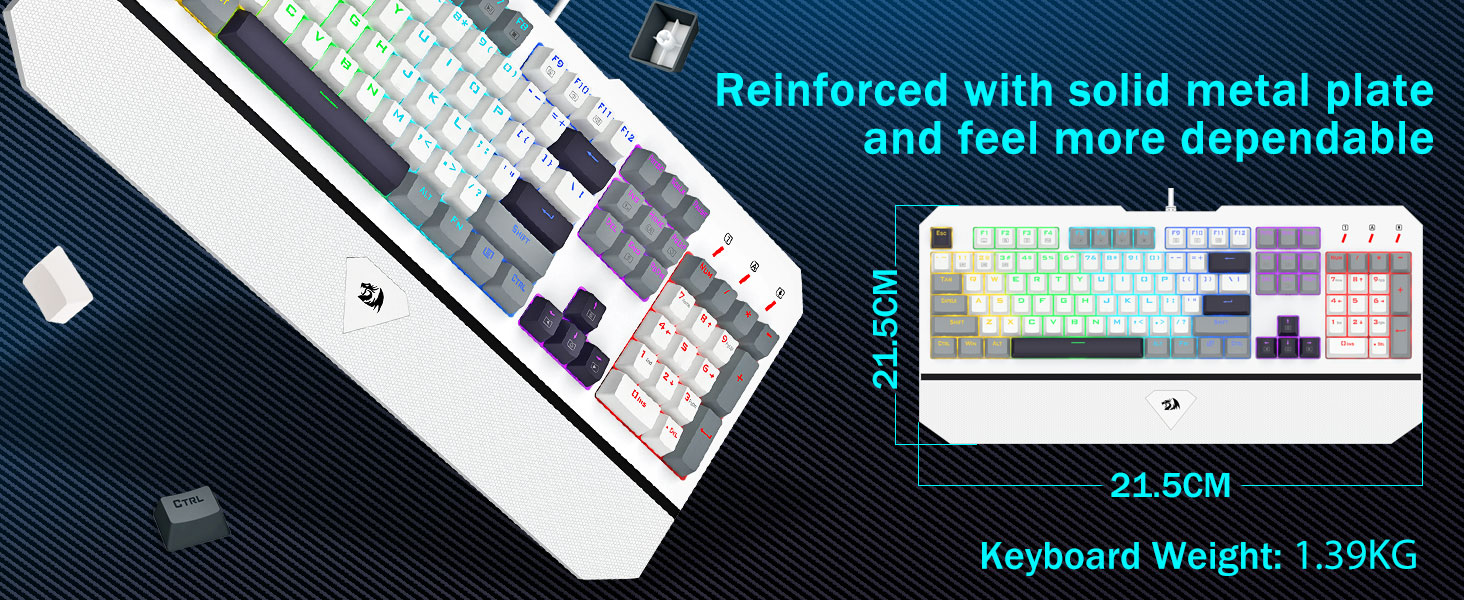【Højt 104-tasters tastatur i fuld størrelse】Tastaturpanelet er lavet af en metallegering i topkvalitet og ABS-materiale og er ekstremt robust, modstandsdygtig over for ridser. Det guldbelagte USB-stik sikrer en stabil, pålidelig forbindelse for ultimativ spilydelse. Med en vægt på 1,39 kg føles dette tastatur som en solid tank i dine hænder, hvilket giver uovertruffen stabilitet under brug.