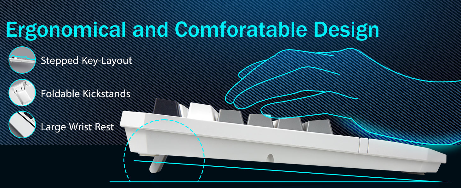 【Avanceret ergonomi til komfort hele dagen】Vores pc-gamer-tastatur er designet med din komfort i tankerne og har et videnskabeligt layout med trappe-op-tastatur og en rummelig håndledsstøtte. Denne opsætning holder dine arme i en naturlig position, hvilket reducerer håndtræthed under længere tids brug. Det kablede tastatur kommer også med 2 robuste, foldbare bagstøtter, så du kan justere hældningen for optimal kropsholdning.