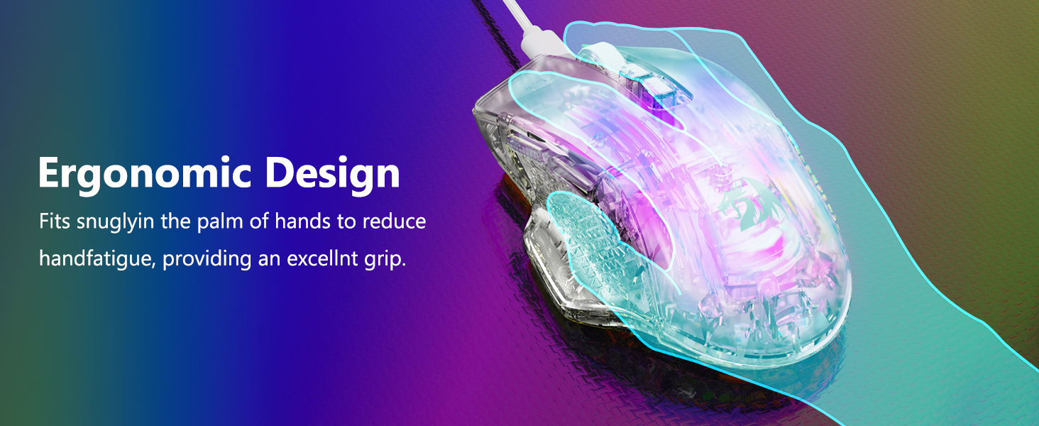 Musen er formet til at ligge naturligt i hånden, hvilket understøtter forlænget brug uden overdreven belastning. Dens struktur giver mulighed for komfortable grebstile, herunder håndflade-, klo- og fingerspidsgreb.