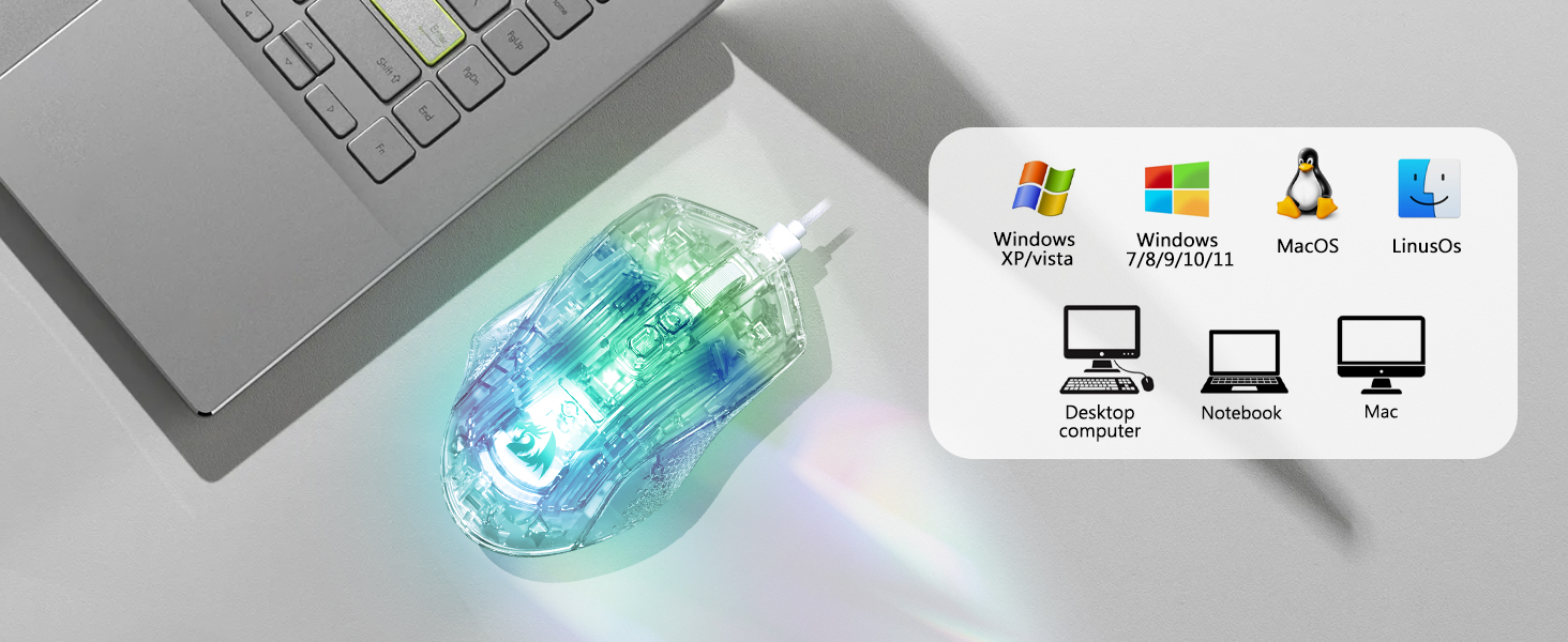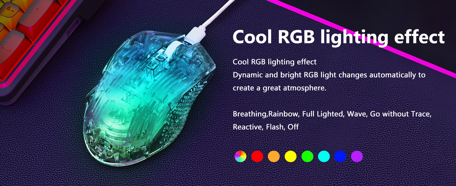 Musen inkluderer otte RGB-lyseffekter, der forbedrer den visuelle appel uden at påvirke ydeevnen. Brugere kan skifte mellem lystilstande for at matche deres opsætning eller personlige præferencer.